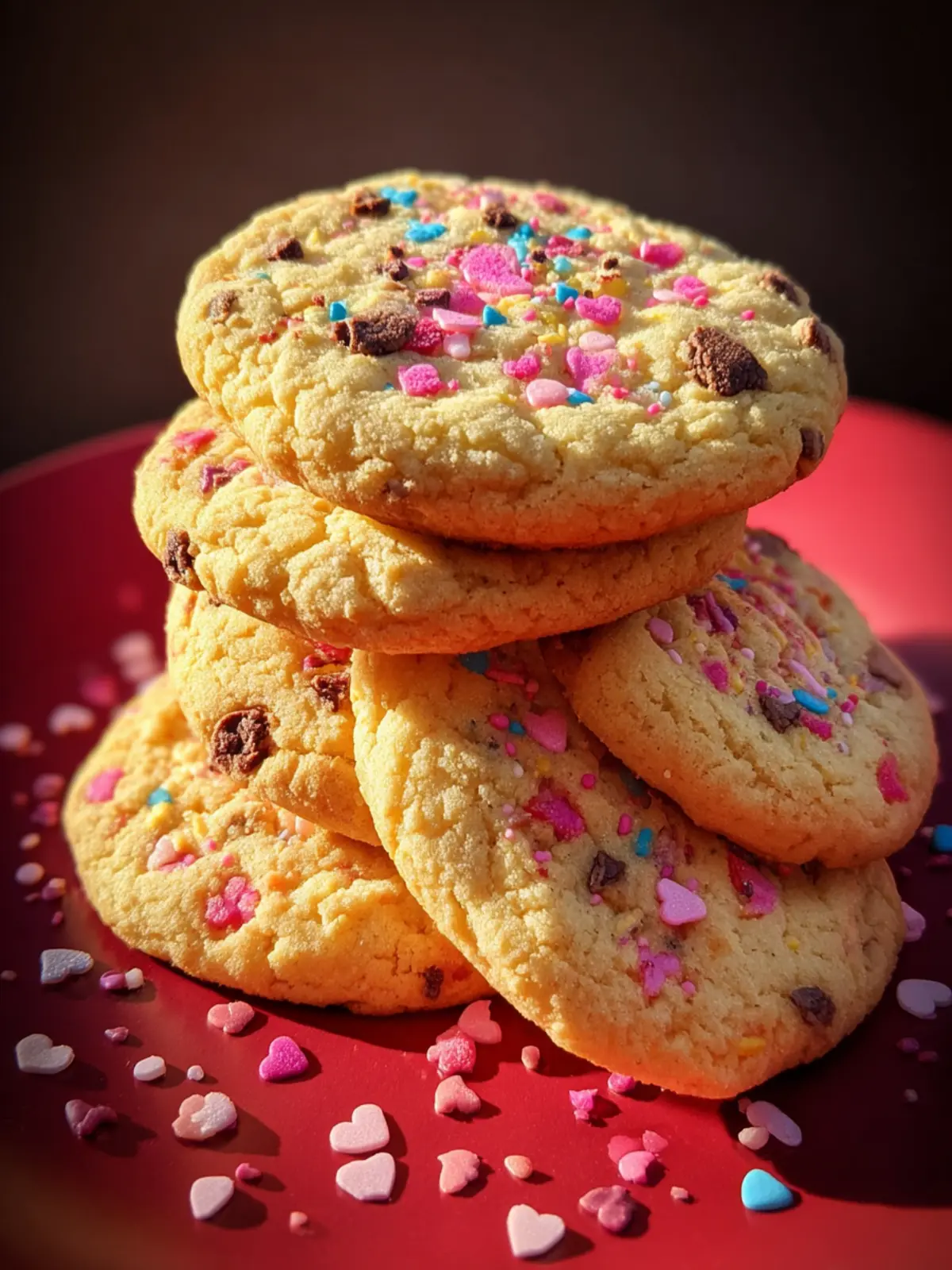 Delicious cookies decorated with heart-shaped sprinkles, perfect for any occasion.