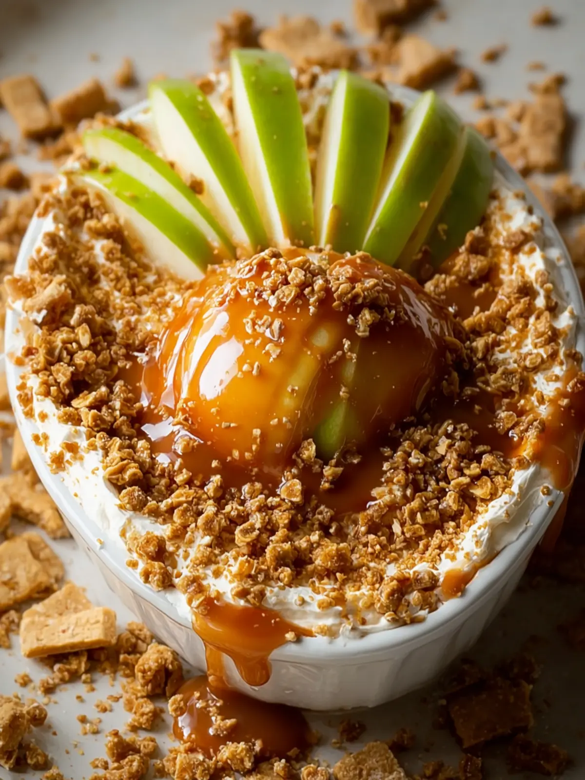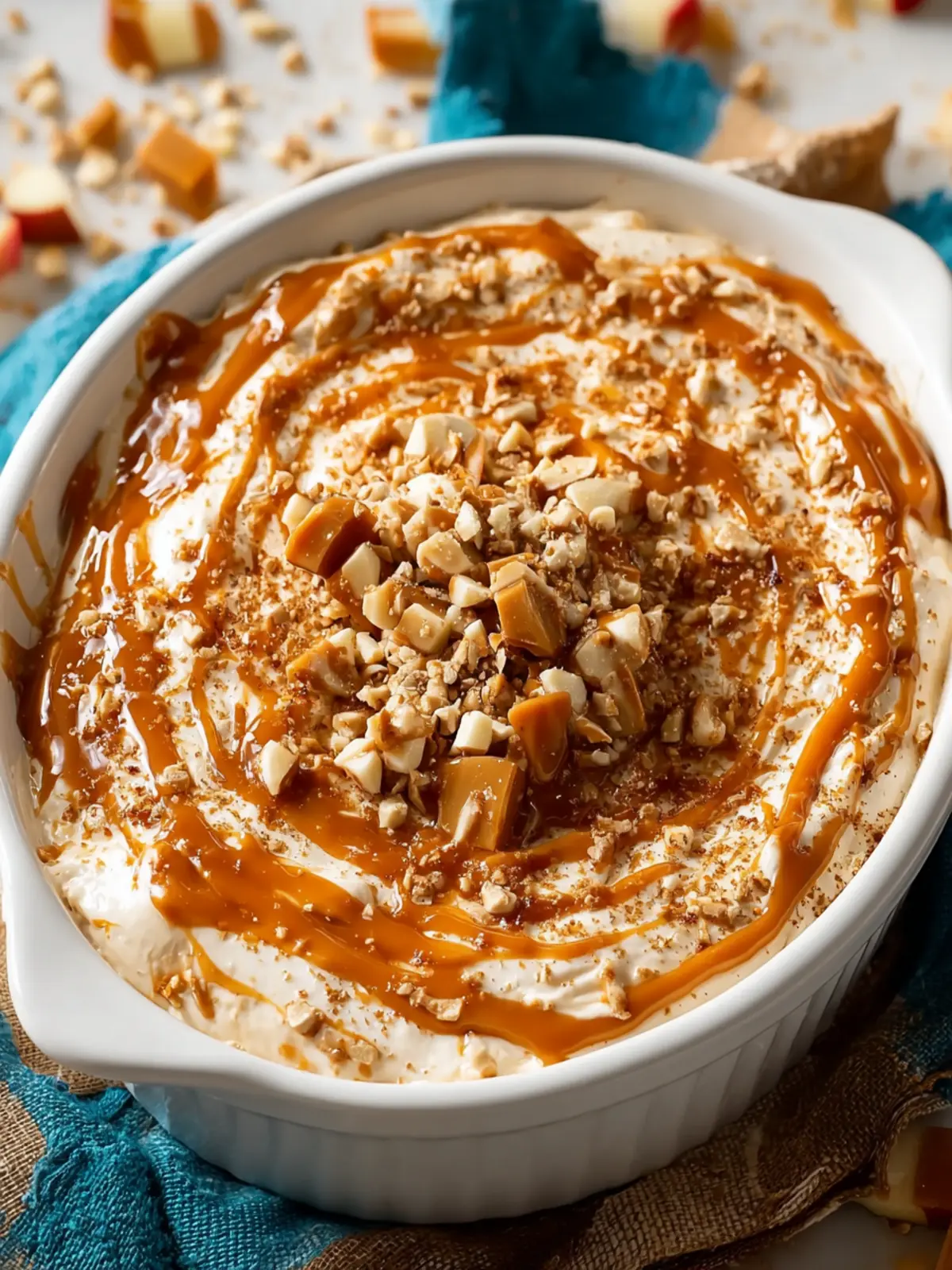 A delicious dip made with cream cheese, caramel, and topped with crunchy bits. Perfect for serving with sliced apples!