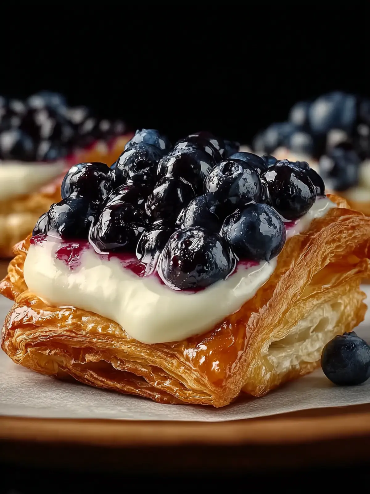A delicious puff pastry filled with cream cheese and fresh blueberries, topped with a sweet glaze.