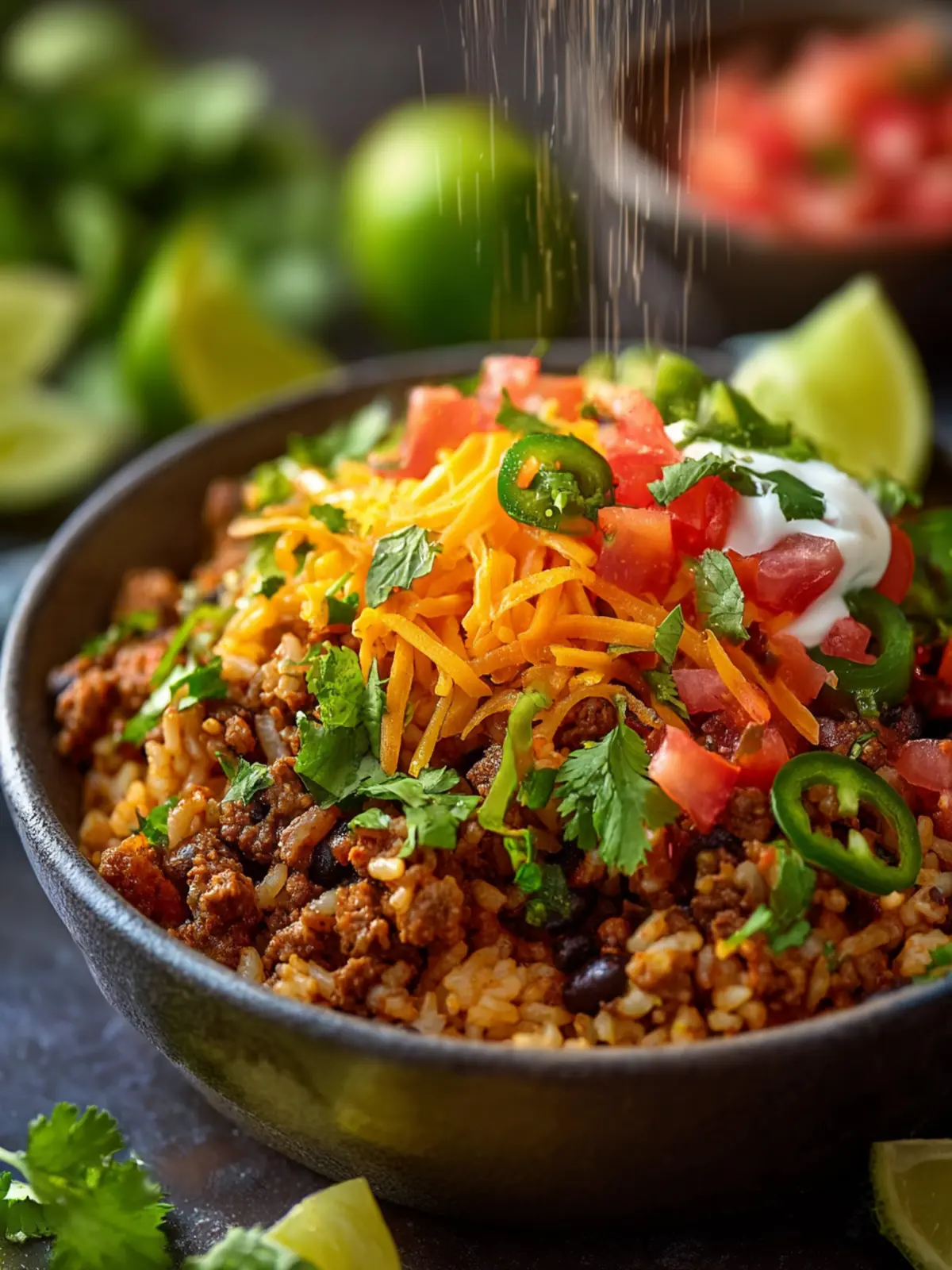 A delicious and customizable taco bowl featuring seasoned ground beef, rice, and fresh toppings.