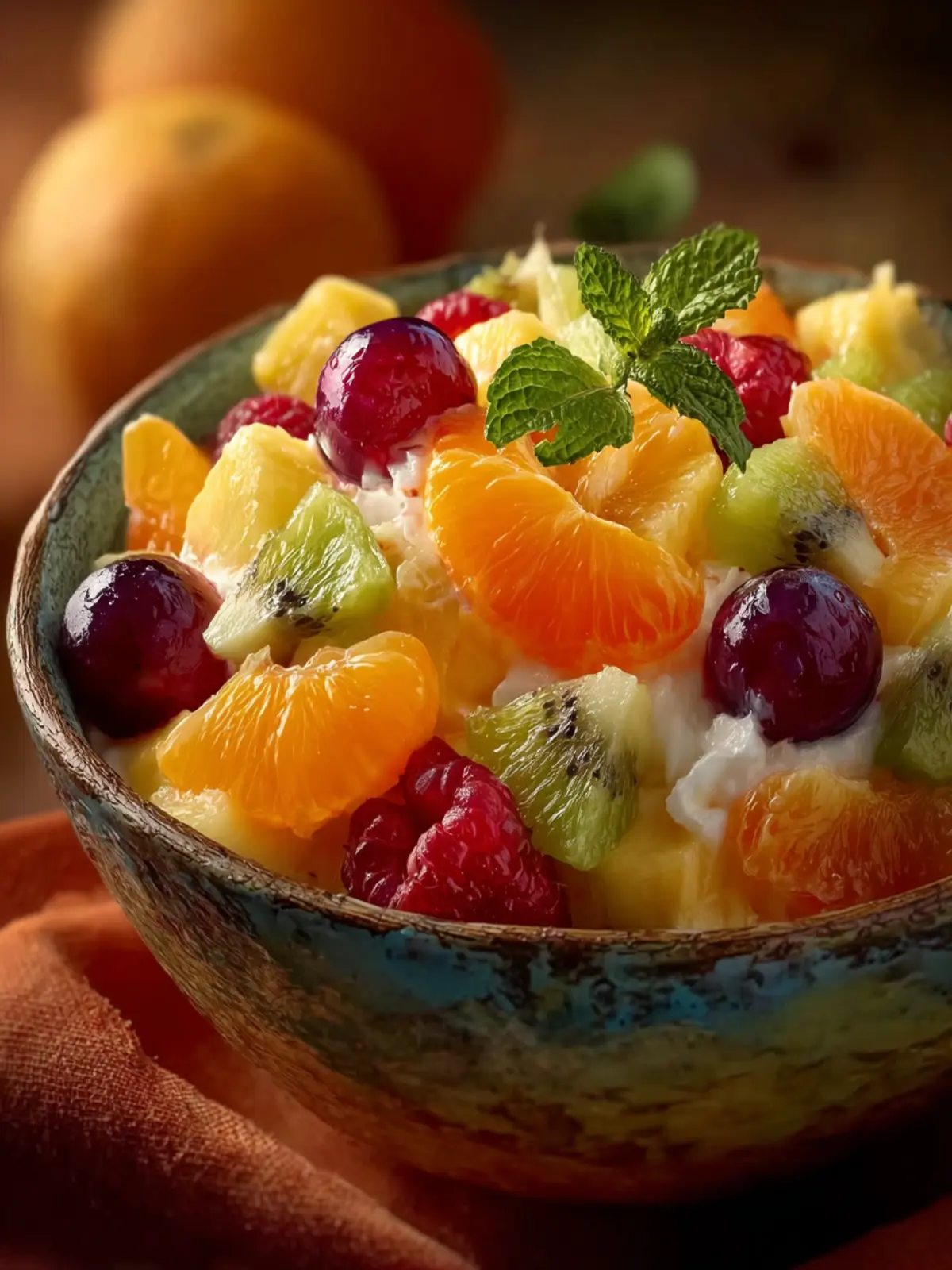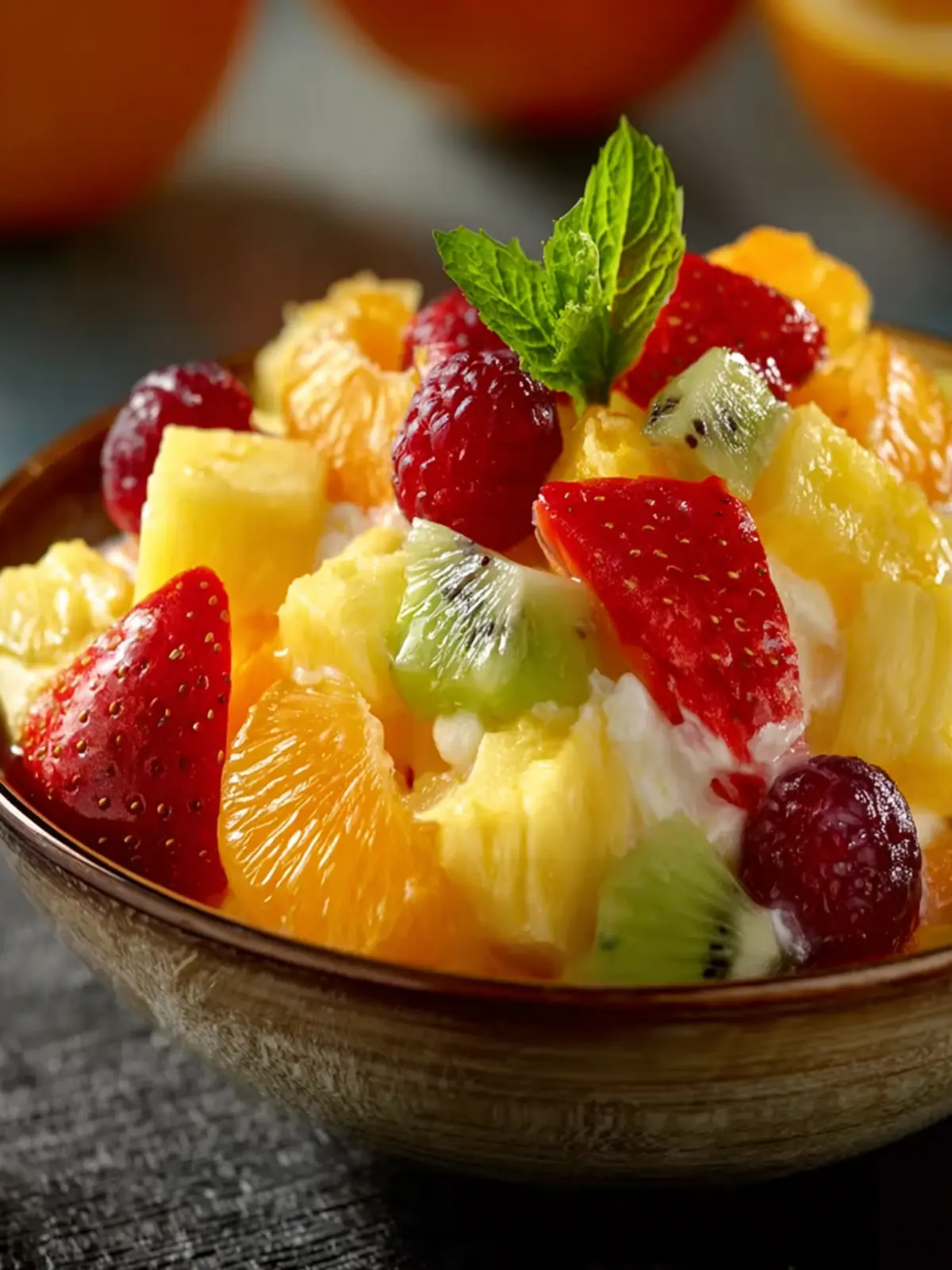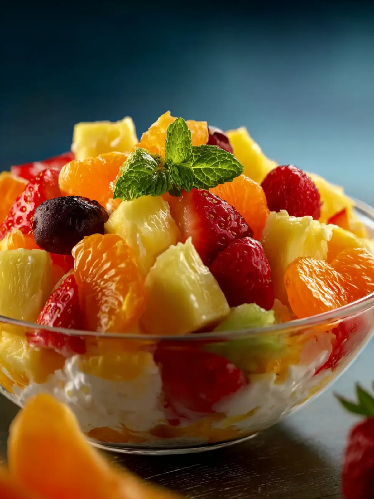 Dessert Bowl: Serve the salad in small dessert bowls with a scoop of vanilla ice cream or whipped cream on top. The creamy sweetness pairs beautifully with the fresh fruit.