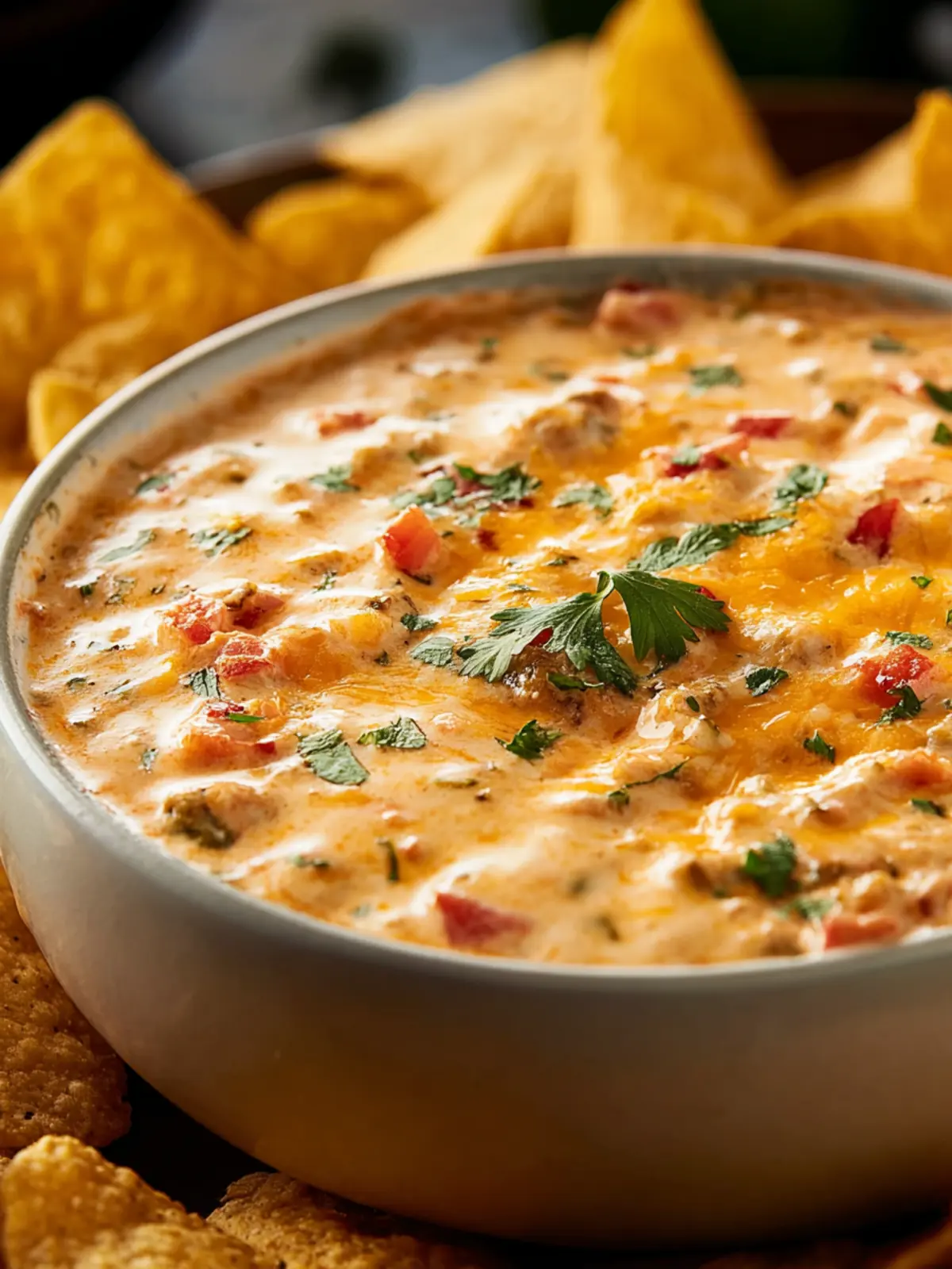 A creamy and cheesy dip made with Rotel tomatoes and processed cheese, perfect for serving with tortilla chips.