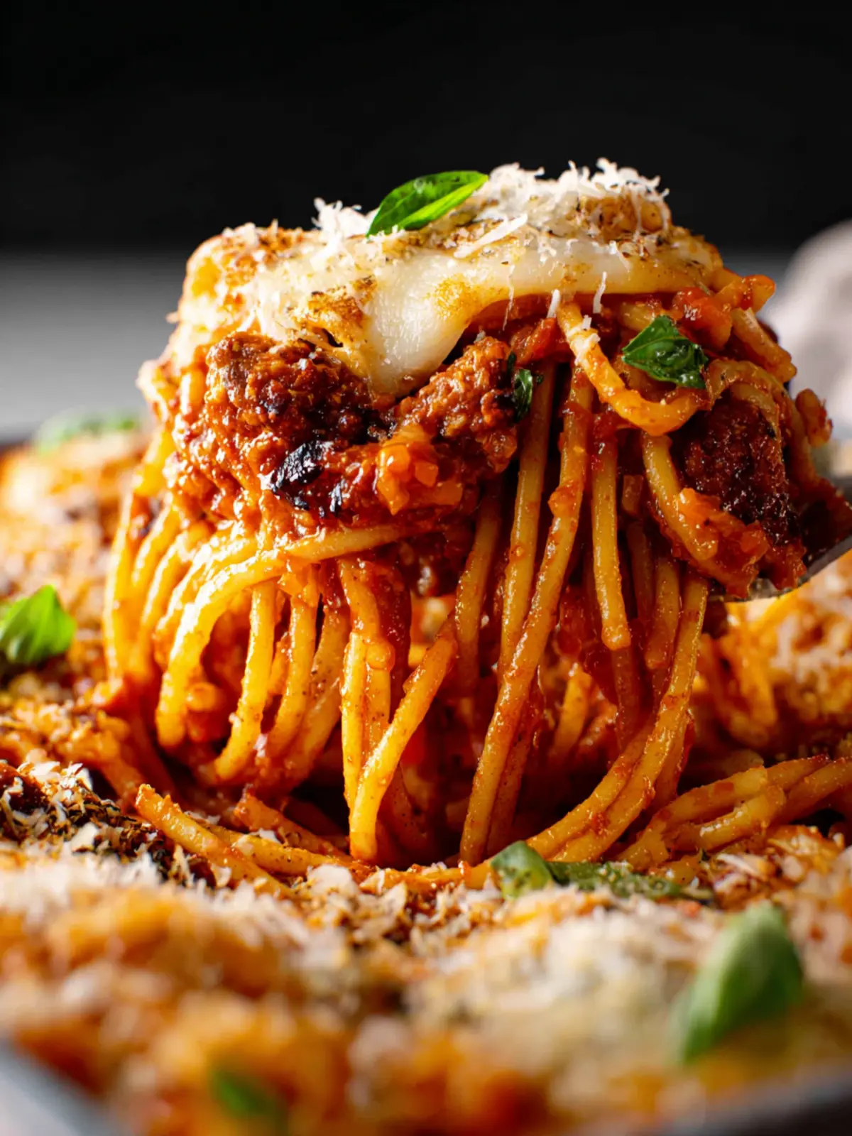 A delicious and cheesy spaghetti casserole that’s perfect for dinner!