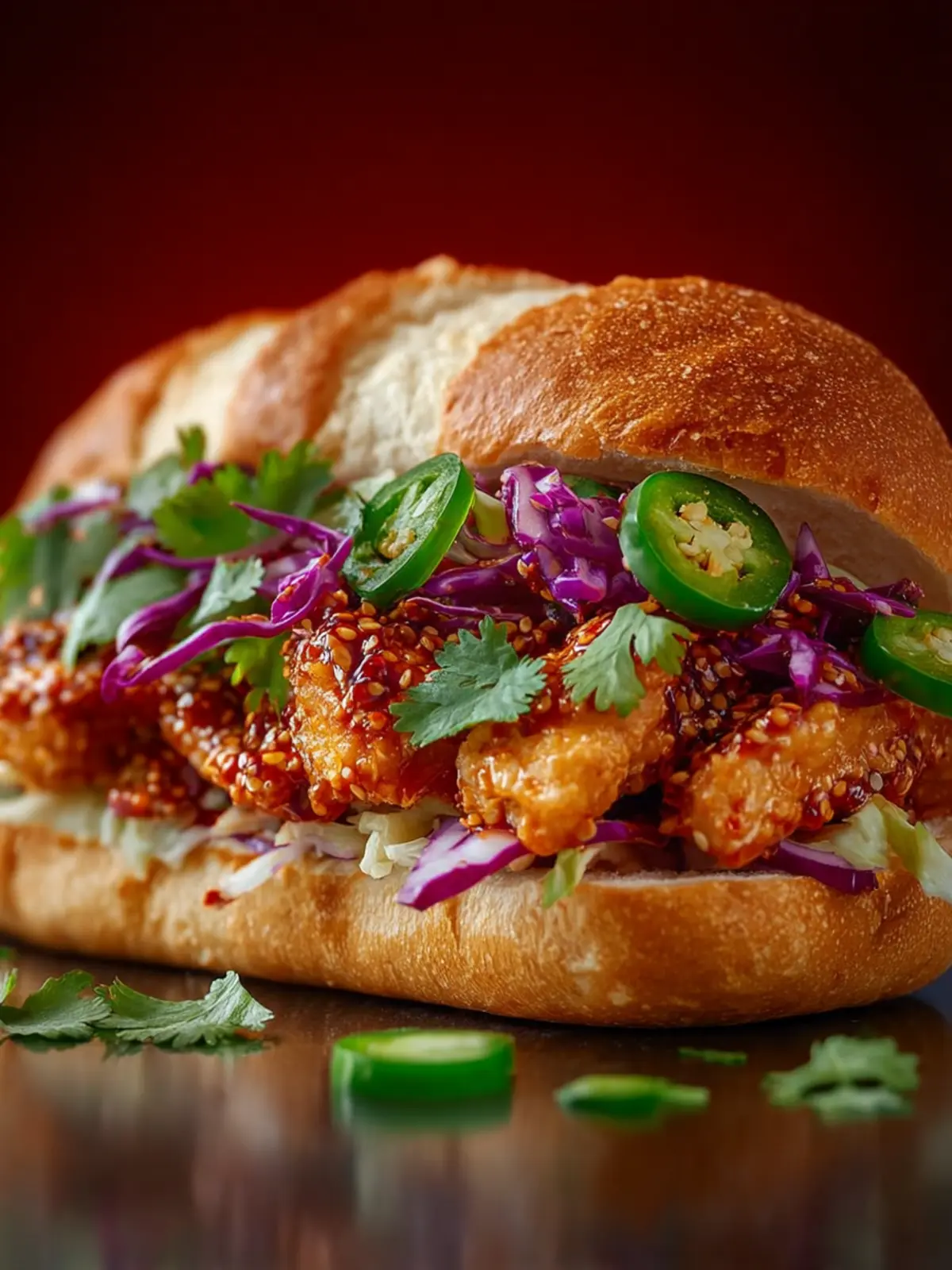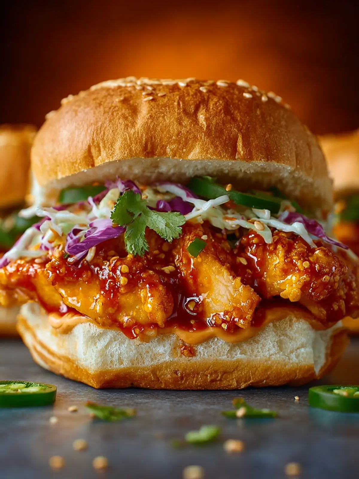 - Assemble the sandwich: add chicken to the bottom bun, top with coleslaw mix, sprinkle with green onions and sesame seeds, then close with the top bun. Serve immediately.