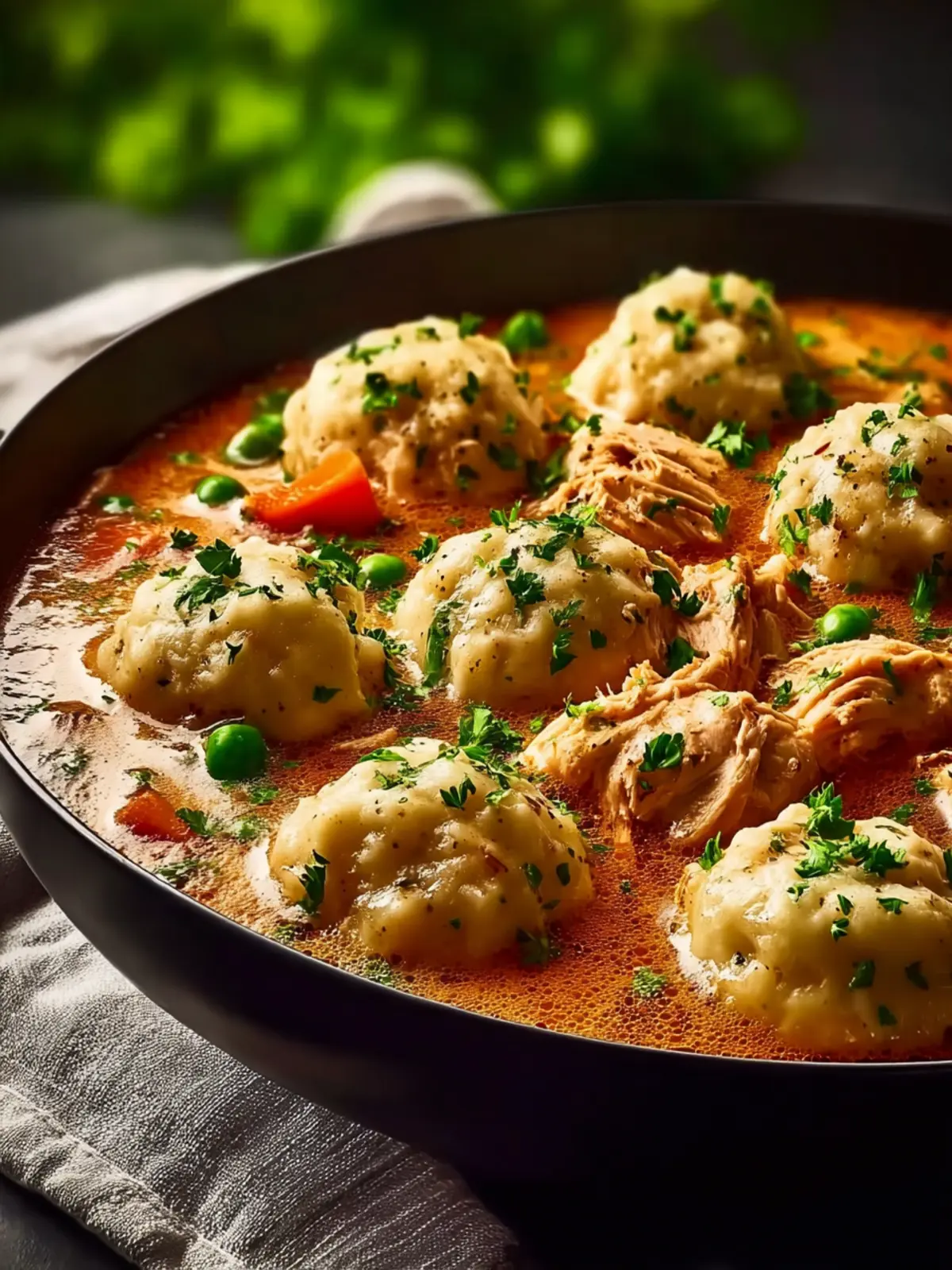 A comforting dish of chicken thighs and fluffy dumplings simmered in a savory broth.